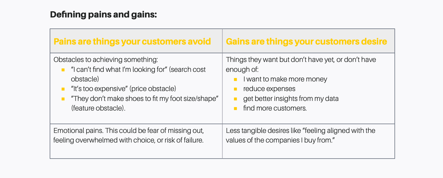 Pains and gains are not hypothetical. They’re real things being experienced by real customers. This means you should describe them in real detail. It’s a red flag if you can’t.