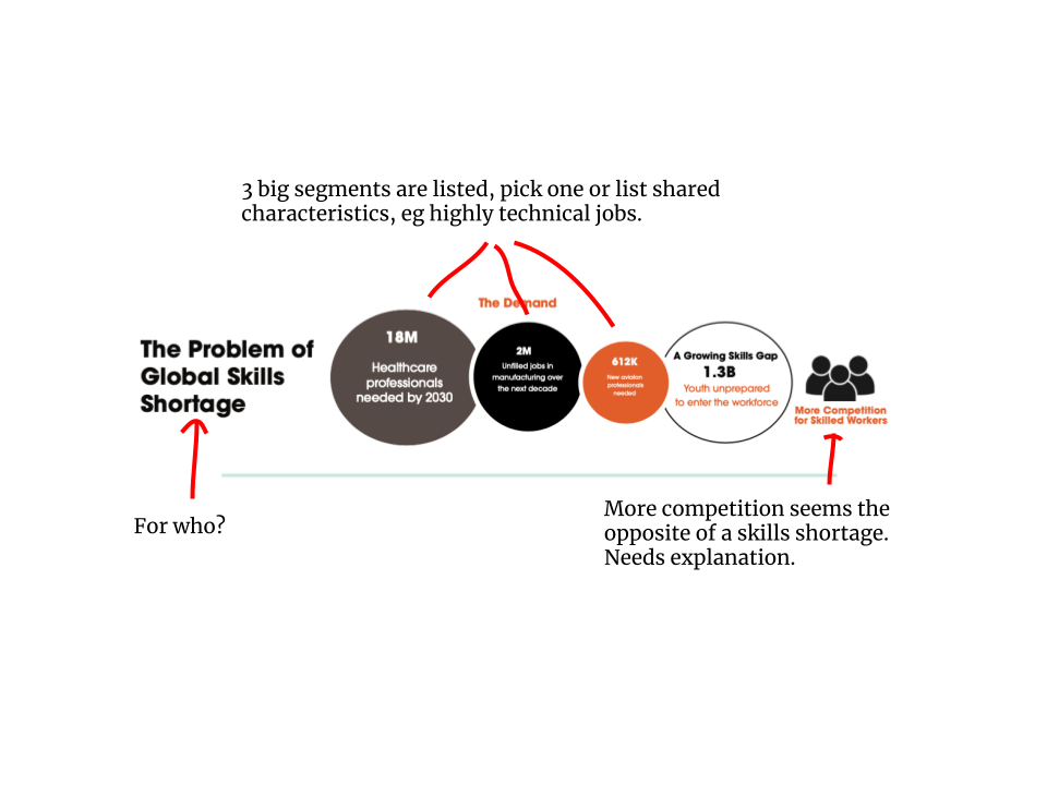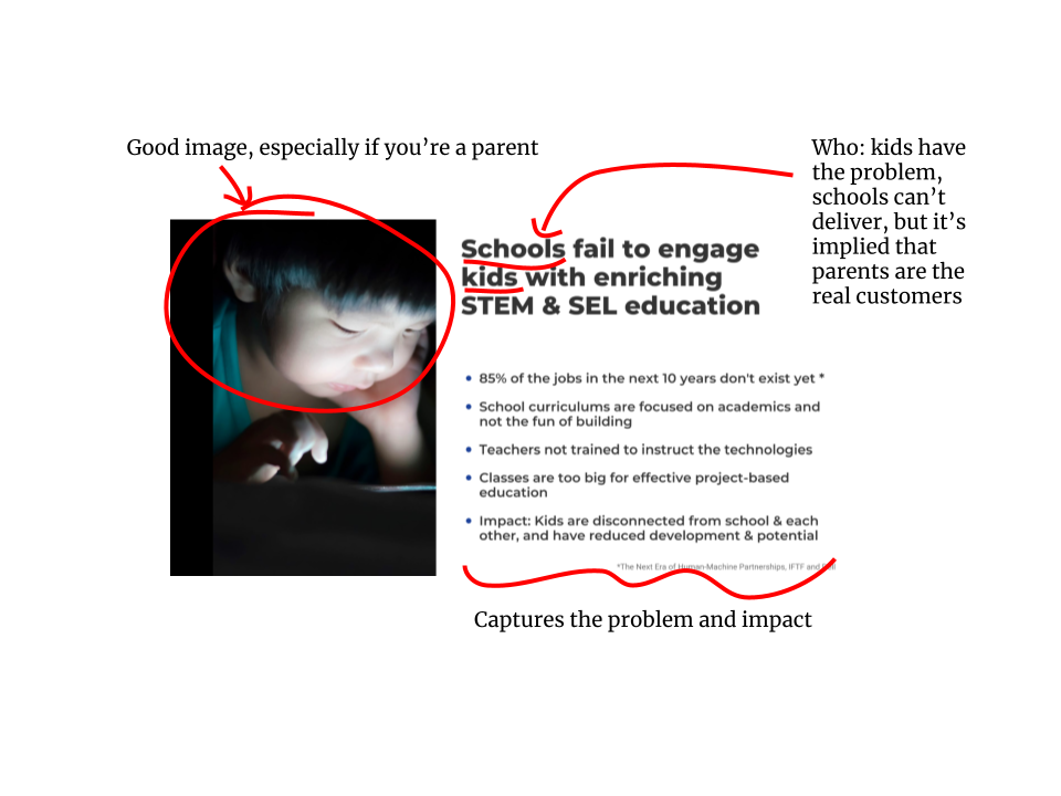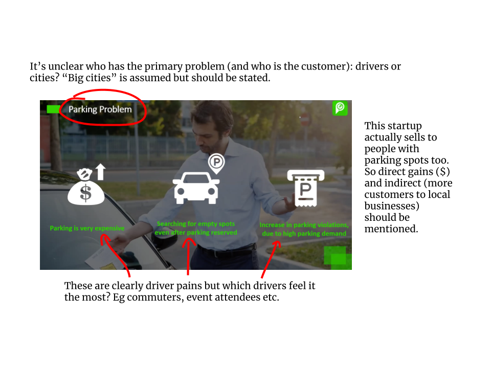 A shocking number of problem slides never mention who has the problem. This is especially true in consumer businesses where entrepreneurs assume the problem applies to everyone (it doesn’t). Showing and telling who experiences the problem is the first indication of whether you have in-depth knowledge of your space.
