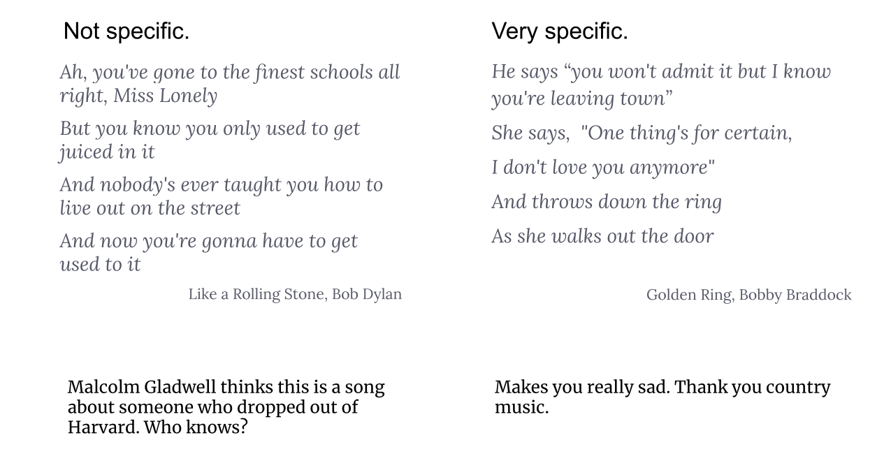 In Revisionist History, Malcolm Gladwell talks about how rock lyrics are abstract and country lyrics are specific.