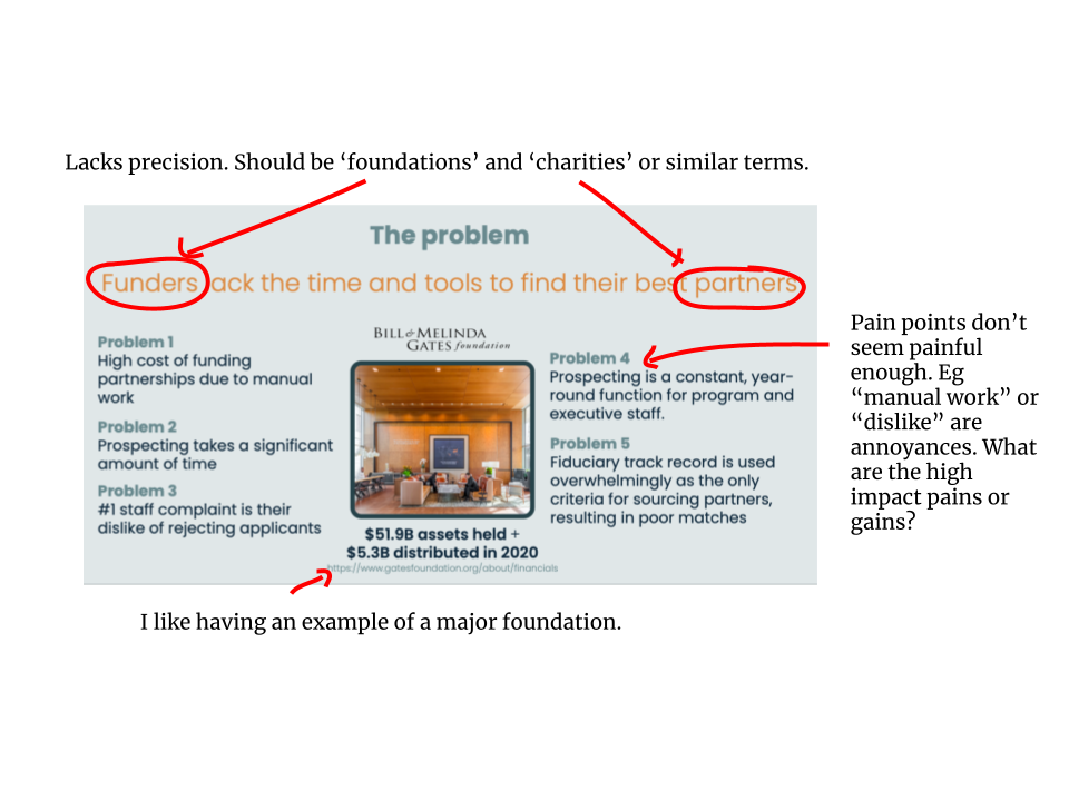- Describing a gap in the market or a financial opportunity is not enough. Get to the root of the pain and who feels it.